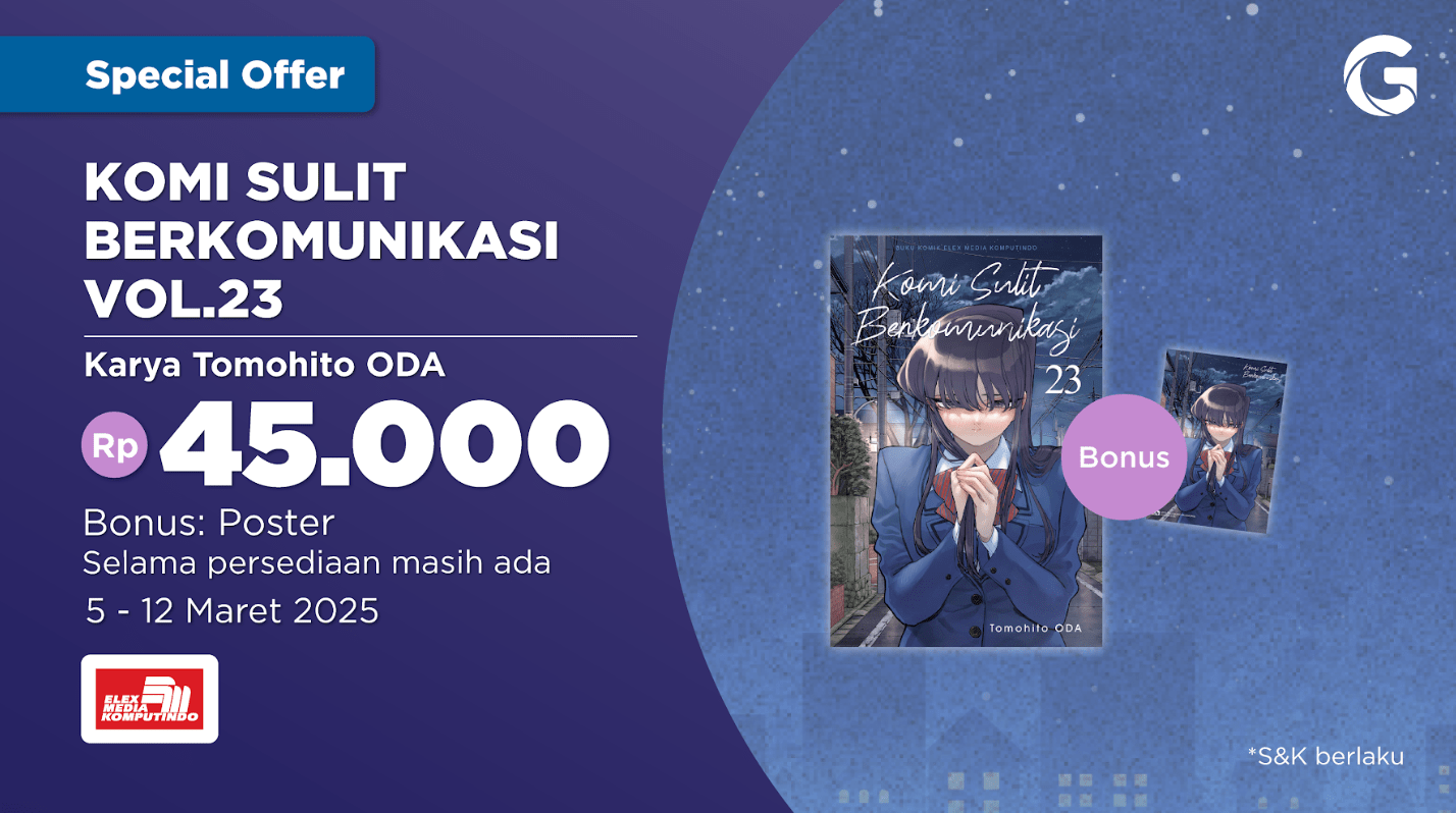 Grameds, sekarang saat yang tepat untuk lengkapi koleksi Komi Sulit Berkomunikasi, karena sedang ada special offer Komi Sulit Berkomunikasi Vol. 23. Dengan harga spesial Rp 45.000, kamu akan mendapat BONUS poster keren, lho! Yuk, buruan lengkapi seri ini, jangan sampai terlewat karena penawaran hanya berlangsung sampai 12 Maret 2025. Ketuk gambar di bawah untuk dapatkan komik Komi Sulit Berkomunikasi!โคต๏ธ๐ค