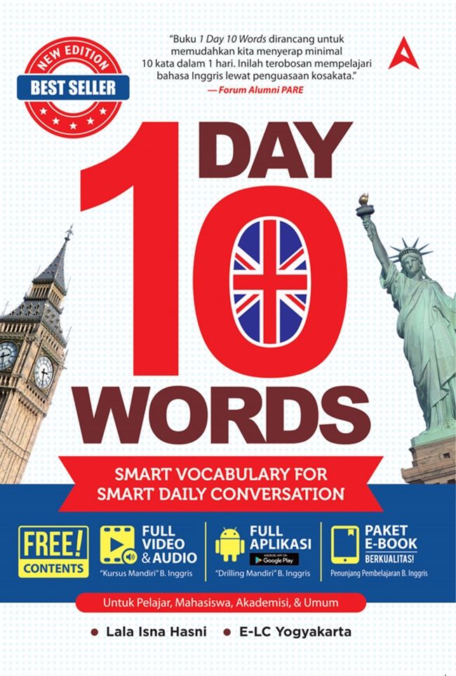 Nah, konsep praktis buku ini, yaitu 1 day 10 words, menuntun kita untuk tekun menyerap ragam kosakata penting. Hanya 10 kosakata dalam sehari? Tenang, itu cuma untuk latihan awal saja. Bakal ada 50-60 kosakata yang bisa dipelajari dalam tiap kategori tema kosakata. Totalnya, ada hampir 3.500-an kosakata dari 60-an lebih kategori kosakata yang disajikan buku ini. Dan yang tak kalah penting, berbagai kosakata tersebut dituangkan ke dalam ratusan contoh percapakan sehari-hari. Tentu saja itu akan mempermudah kita dalam menyerap dan menguasainya.