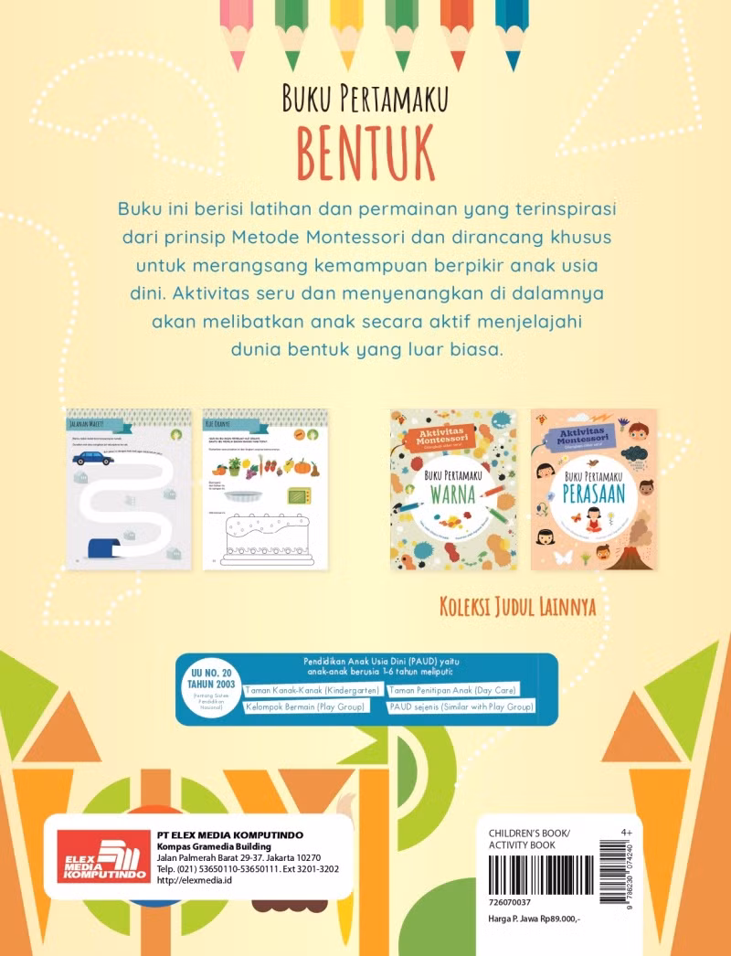 Buku ini berisi latihan dan permainan yang terinspirasi dari prinsip Metode Montessori dan dirancang khusus untuk merangsang perkembangan serta kemampuan kognitif anak-anak usia dini. Melalui aktivitas yang penuh warna, menyenangkan, dan melibatkan anak secara aktif, anak-anak akan belajar mengenali bentuk dan selanjutnya berani melangkah sendiri untuk mulai menjelajahi dunia!
