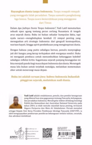 Dalam Apa Jadinya Dunia Tanpa Indonesia?, Yudi Latif menuturkan sebuah epos agung tentang peran cerlang Nusantara di tengah arus sejarah dunia. Buku ini bukan sekadar kumpulan fakta, tapi nyala narasi menghidupkan kembali 22 simpul penting yang menegaskan arti strategis Indonesia: dari geografi kosmopolitan, warisan hayati, hingga spirit pembebasan yang menginspirasi dunia.