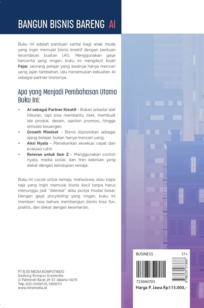 Buku ini adalah panduan santai bagi anak muda yang ingin memulai bisnis kreatif dengan bantuan kecerdasan buatan (Al). Menggunakan gaya bercerita yang ringan, buku ini mengikuti kisah Fajar, seorang pelajar yang awalnya hanya mencari uang jajan tambahan, lalu menemukan kekuatan Al sebagai partner bisnisnya.