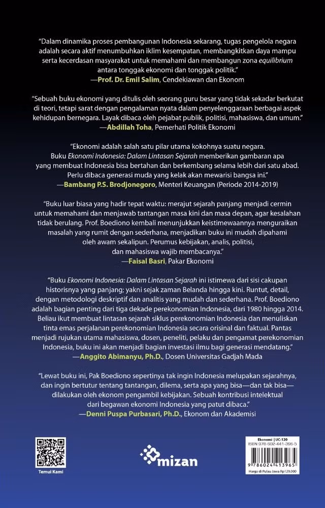"Buku Ekonomi Indonesia: Dalam Lintasan Sejarah ini istimewa dari sisi cakupan historisnya yang panjang; yakni sejak zaman Belanda hingga kini. Runtut, detail, dengan metodologi deskriptif dan analitis yang mudah dan sederhana. Prof. Boediono adalah bagian penting dari tiga dekade perekonomian Indonesia, dari 1980 hingga 2014. Beliau ikut membuat lintasan sejarah siklus perekonomian Indonesia dan menuliskan tinta emas perjalanan perekonomian Indonesia secara orisinal dan faktual. Pantas menjadi rujukan utama mahasiswa, dosen, peneliti, pelaku dan pengamat perekonomian Indonesia, buku ini akan menjadi bagian investasi ilmu bagi generasi mendatang." -Anggito Abimanyu, Ph.D., Dosen Universitas Gadjah Mada