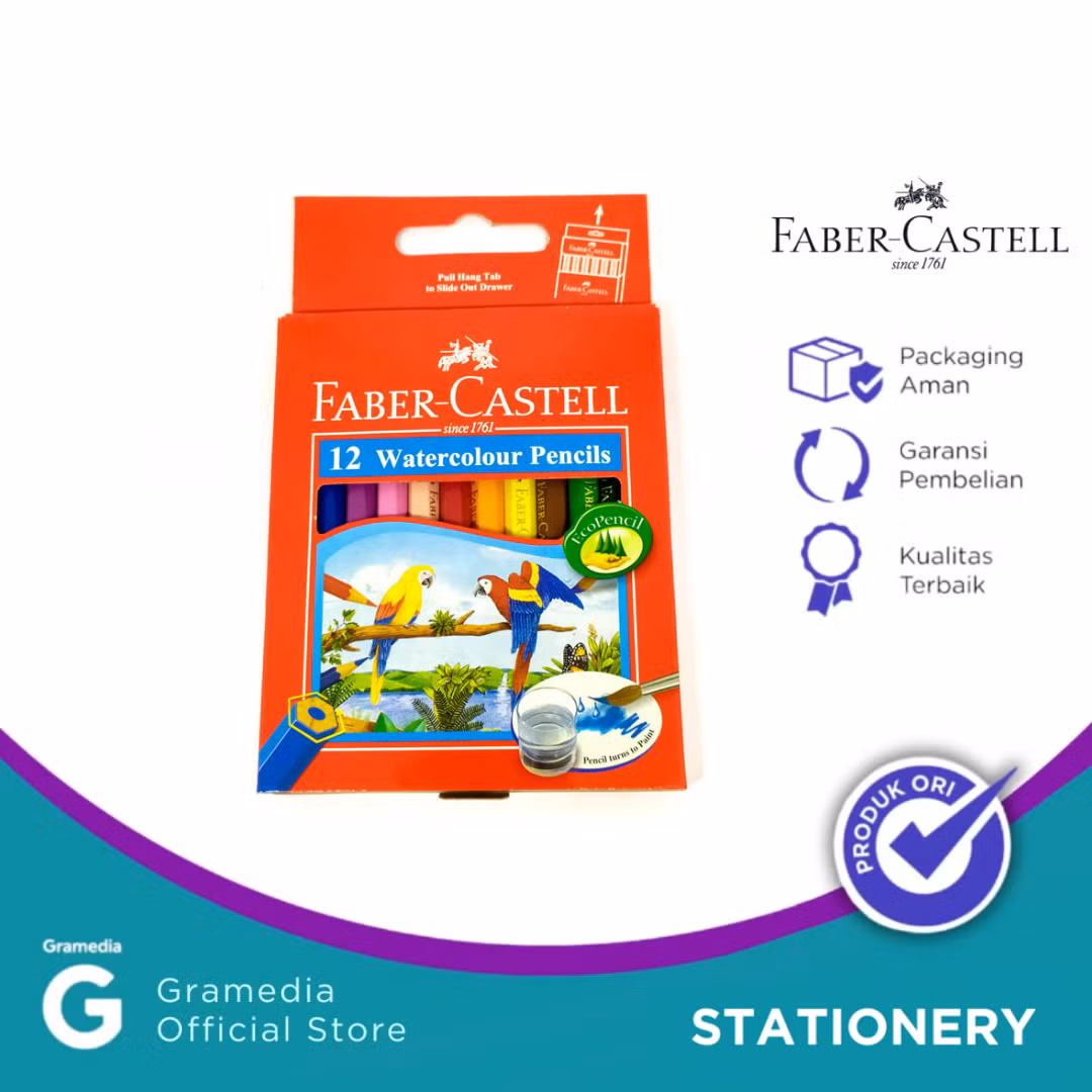 Faber Castell Watercolor Pencils merupakan produk dari faber castell yang berisikan 12 warna, sangat berkualitas. Cat pensil warna ini memiliki warna yang cukup bervariasi dan warna yang dihasilkan sangatlah intens. Pensilnya yang lembut membuat Anda lebih dapat mengaplikasikan warna sesuai dengan tingkat warna yang diinginkan. Cat pensil warna ini dapat dilarutkan pada air dan dibaur sehingga meningkatkan kreativitas anak Anda. Menggunakan sistem SV Bonding membuat ujung pensil tidak mudah patah. Bahan yang digunakan pun sangat aman sehingga tidak membahayakan bagi anak-anak. Kualitas premium menghasilkan warna lebih cerah dan bagus.