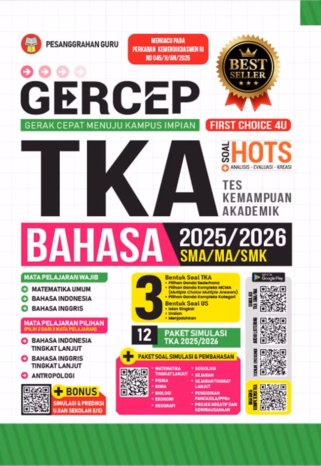 Buku Gercep TKA Bahasa SMA/MA/SMK 2025/2026 ini disusun untuk memberikan gambaran terkait soal-soal TKA lengkap dengan pembahasannya, termasuk soal HOTS untuk melatih siswa berpikir kritis. Buku ini dilengkapi juga dengan Bonus berupa simulasi dan prediksi Ujian Sekolah (US), CBT TKA yang dapat diunduh dengan memindai kode QR yang ada di kover depan buku. Khusus untuk soal-soal bahasa Inggris dan bahasa Inggris Tingkat Lanjut bagian Listening dapat diunduh juga dengan cara memindai kode QR yang ada di kover depan buku.