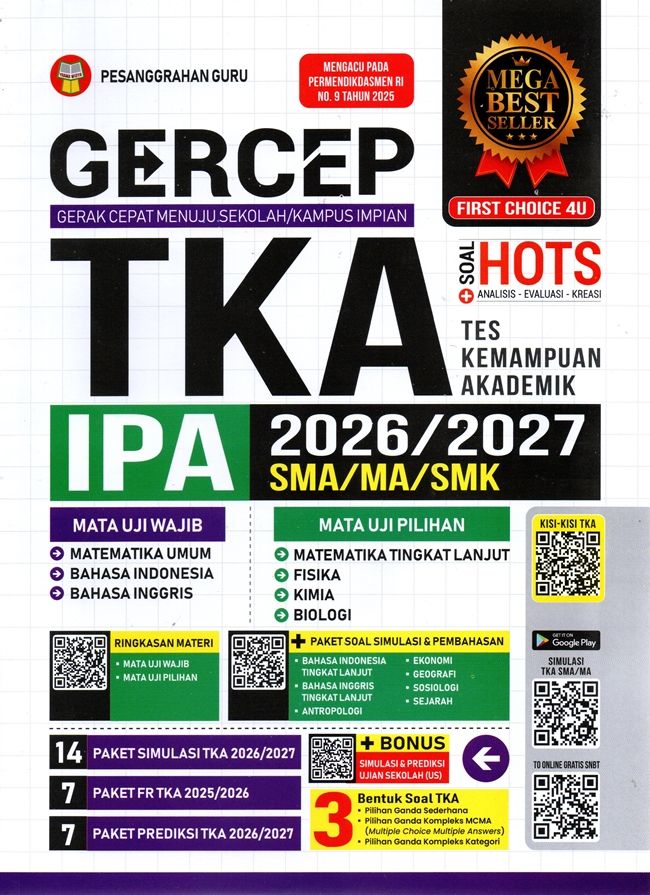 Buku “Gercep (Gerak Cepat Menuju Sekolah/Kampus Impian) TKA (Tes Kemampuan Akademik) IPA SMA/MA/SMK 2026/2027” ini merupakan salah satu sumber belajar yang bisa digunakan untuk mengenal tipe-tipe soal TKA. Buku ini memuat 7 mata uji lengkap, yaitu 3 mata uji wajib dan 4 mata uji pilihan. Mata uji wajibnya yaitu Matematika Umum, Bahasa Indonesia, dan Bahasa Inggris. Sementara itu untuk kelompok IPA, mata uji pilihannya yaitu Matematika Tingkat Lanjut, Fisika, Kimia, dan Biologi. Dari keempat mata uji pilihan, Anda dapat memilih 2 mata uji yang disesuaikan dengan jurusan yang akan Anda pilih di PTN. Misalnya, Anda akan masuk PTN melalui jalur SNBP. Anda memilih jurusan teknik mesin. Pada saat TKA, Anda akan mengerjakan soal TKA sebanyak 5 mata uji yang terdiri atas 3 mata uji wajib (Matematika Umum, Bahasa Indonesia dan Bahasa Inggris) dan 2 mata uji pilihan (Matematika Tingkat Lanjut dan Fisika). Buku ini disusun untuk memberikan gambaran terkait soal-soal TKA lengkap dengan pembahasannya, termasuk soal HOTS untuk melatih siswa berpikir kritis.
