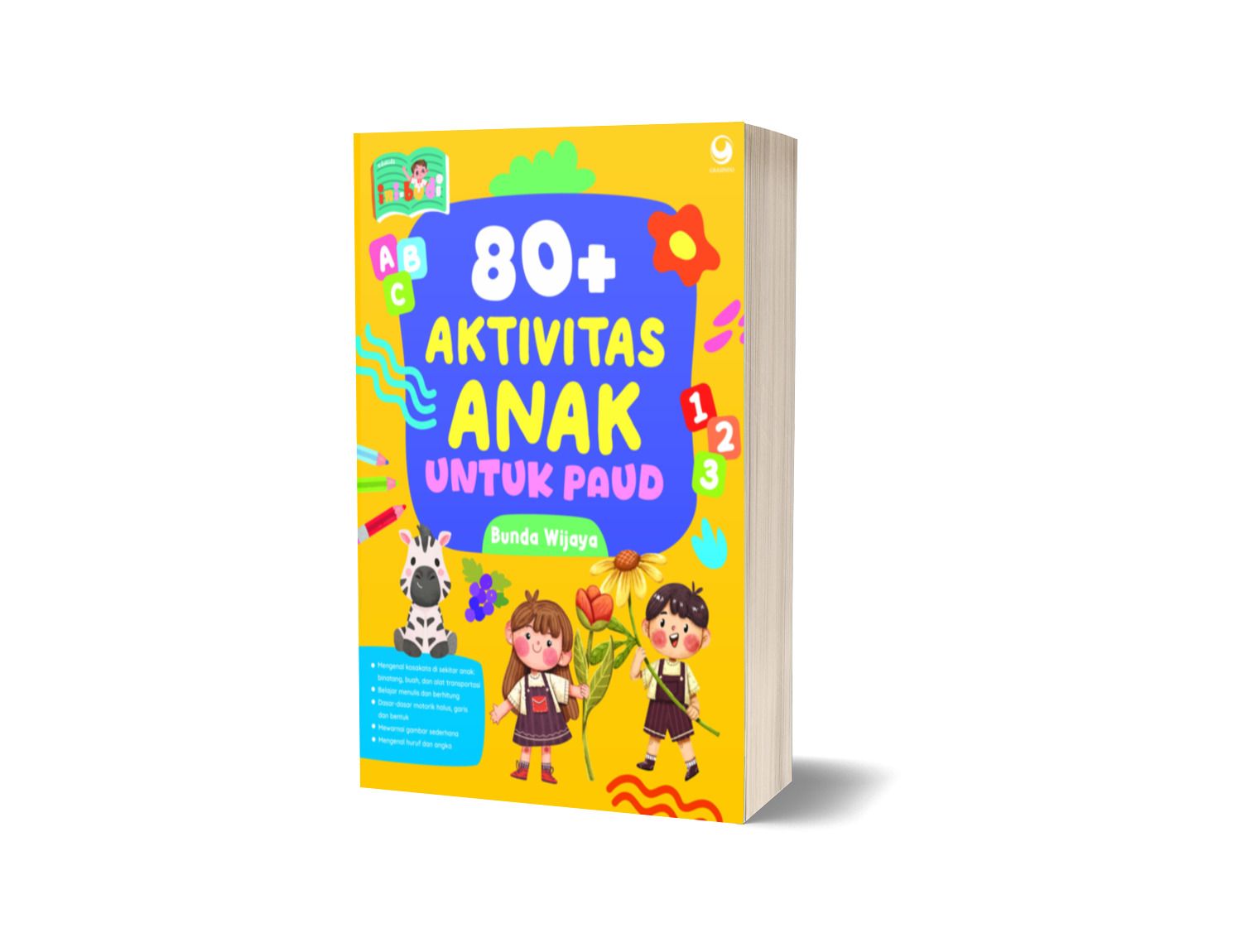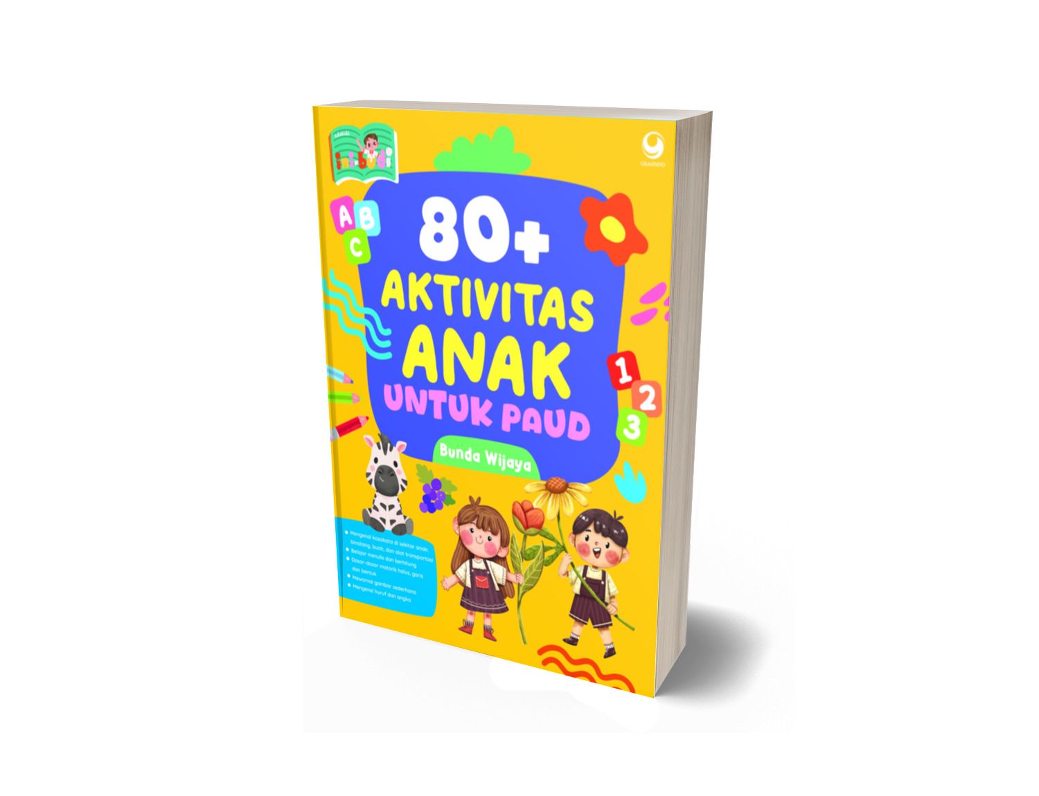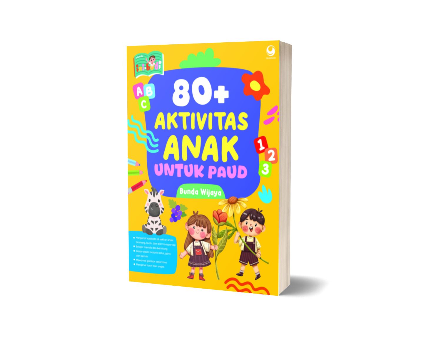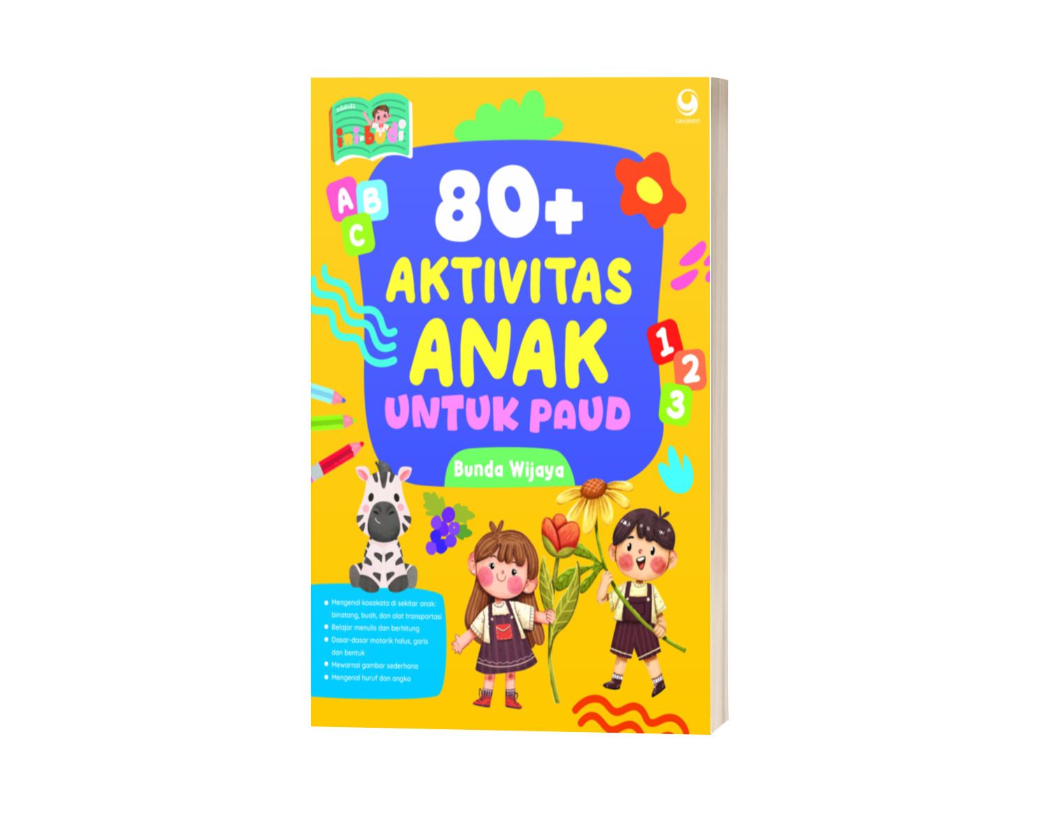 80+ AKTIVITAS ANAK UNTUK PAUD mengenalkan kepada anak-anak usia 2—3 tahun pada berbagai aktivitas yang mendukung pengetahuan dasar tentang huruf, angka, bentuk, binatang, buah, yang disusun dengan aktivitas menarik dan menyenangkan.