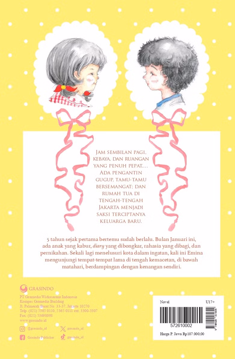 5 tahun sejak pertama bertemu sudah berlalu. Bulan Januari ini, ada anak yang kabur, diary yang dibongkar, rahasia yang dibagi, dan pernikahan. Sekali lagi menelusuri kota dalam ingatan, kali ini Emina mengunjungi tempat-tempat lama di tengah kemacetan, di bawah matahari, berdampingan dengan kenangan sendiri.