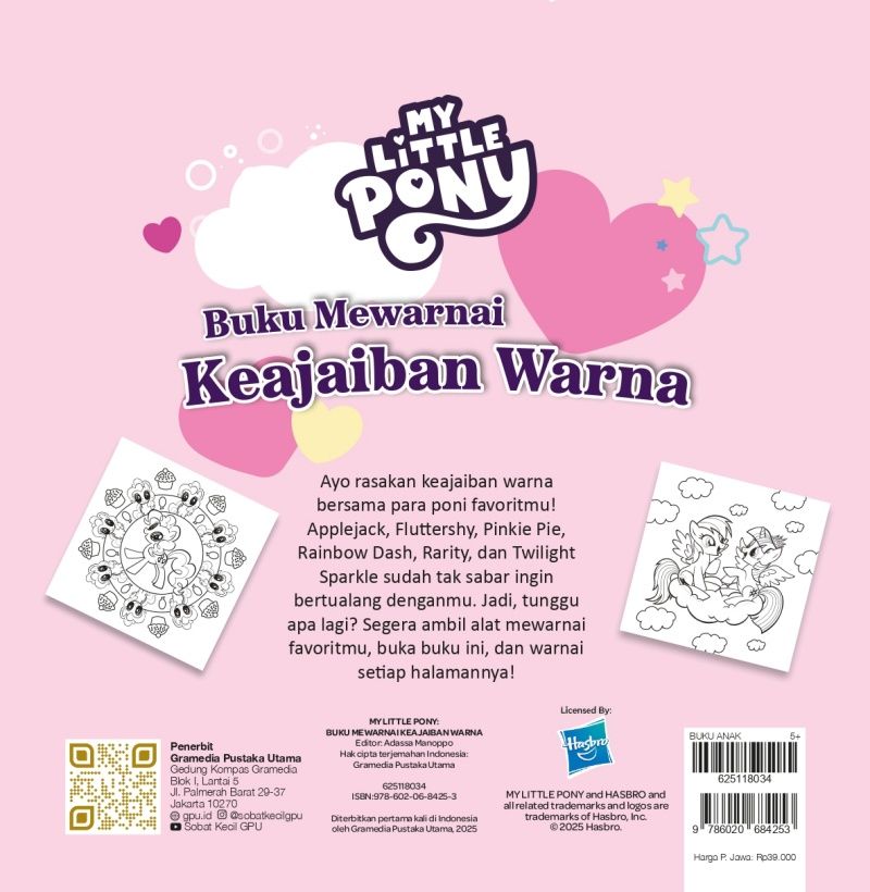 Ayo rasakan keajaiban warna bersama para poni favoritmu! Applejack, Fluttershy, Pinkie Pie, Ranibow Dash, Rarity, dan Twilight Sparkle sudah tak sabar ingin bertualang denganmu. Jadi, tunggu apa lagi? Segera ambil alat mewarnai favoritmu, buka buku ini, dan warnai setiap halamannya!