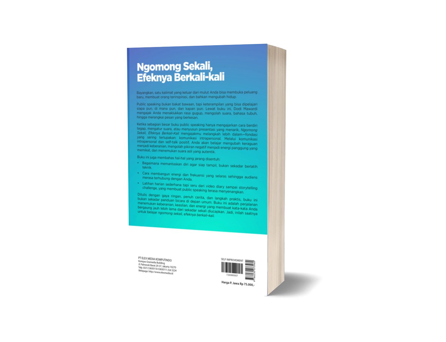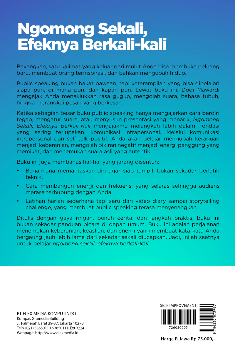 Ketika sebagian besar buku public speaking hanya mengajarkan cara berdiri tegap, mengatur suara, atau menyusun presentasi yang menarik, Ngomong Sekali, Efeknya Berkali-Kali mengajakmu melangkah lebih dalam—fondasi yang sering terlupakan: komunikasi intrapersonal. Melalui komunikasi intrapersonal dan self-talk positif, Anda akan belajar mengubah keraguan menjadi keberanian, mengolah pikiran negatif menjadi energi panggung yang memikat, dan menemukan suara asli yang autentik.