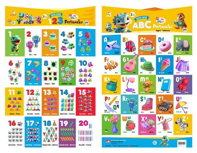 Opredo 2 in 1 Poster Pintar Hello Baby Dino : 123 & ABC Pertamaku direkomendasikan untuk anak usia 3-6 tahun. Buku ini adalah alat yang ideal untuk membantu anak-anak belajar tentang huruf dan angka dengan cara yang menyenangkan dan interaktif.