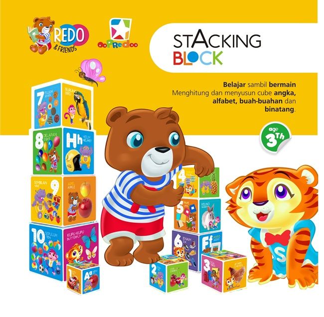 Stacking Block Redo & Friends adalah produk mainan yang menarik dan mendidik untuk anak-anak. Anak-anak dapat melakukan kegiatan dengan menyusun 10 cube/box dari ukuran yang paling besar sampai ukuran yang terkecil. Anak-anak dapat belajar mengenal bermacam-macam benda, binatang, buah, mengenal angka dan alfabet. Dengan ilustrasi yang menarik dan lucu dari Redo dan temannya.