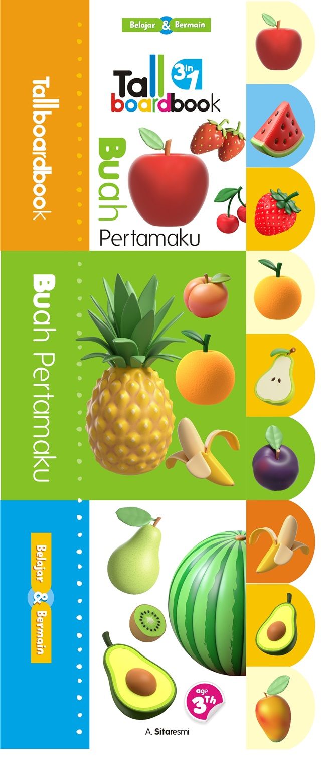 Buku dengan ukuran meninggi dengan tiga buku jadi satu. Berisi pengenalan tentang buah-buahan yang ada di lingkungan. Tall board book dirancang untuk si kecil dengan beraktivitas membuka sendiri tiap halaman bukunya. Dengan gambar yang menarik dan penuh warna sesuai dengan aslinya memudahkan si kecil untuk memahaminya. Tiap halamannya terdapat tab yang terdapat di sampingnya.