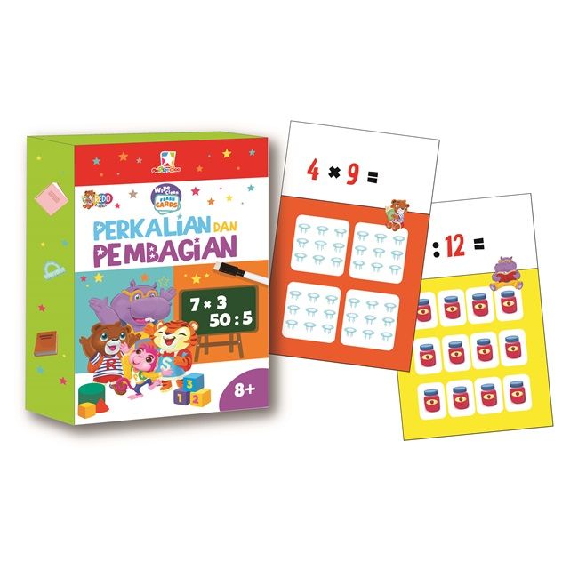 Terdapat 24 kartu full color berisi soal-soal berhitung dasar perkalian pembagian.