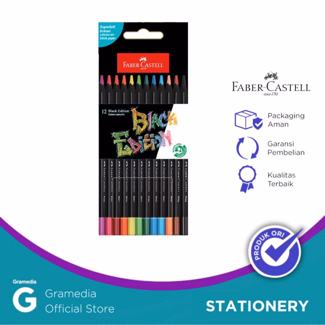 Black Edition Colour Pencil berkualitas terbaik dari Faber-Castell, cocok untuk remaja yang trendi dan stylish. Black Edition Colour Pencil sangat nyaman digenggam dengan bentuknya yang triangular sehingga penggunanya lebih leluasa mengoreskan pensil warna ini untuk berkreasi. Hadir dengan 2 ukuran yaitu set 12 dan 24, Black Edition Colour Pencil memiliki fitur Super Soft Lead dalam pensil warna yang cerah serta terbuat dari kayu yang tersertifikasi sustainable forestry sehingga ramah lingkungan.