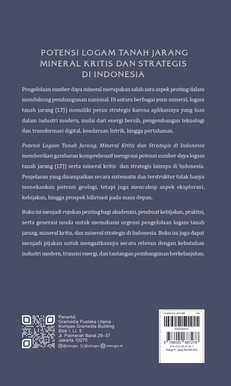 Buku ini menjadi rujukan penting bagi akademisi, pembuat kebijakan, praktisi, serta generasi muda untuk memahami urgensi pengelolaan logam tanah jarang, mineral kritis, dan mineral strategis di Indonesia. Buku ini juga dapat menjadi pijakan untuk mengaitkannya secara relevan dengan kebutuhan industri modern, transisi energi, dan tantangan pembangunan berkelanjutan.