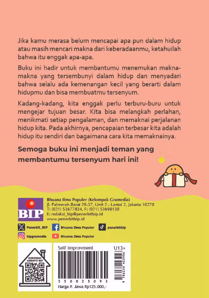 Kalau kamu merasa belum mencapai apa-apa dalam hidup, atau masih bertanya-tanya apa makna dari hidup, ketahuilah bahwa itu enggak apa-apa. Buku ini hadir untuk membantumu menemukan makna-makna yang tersimpan dalam hidup dan menyadari bahwa selalu ada kemenangan-kemenangan kecil yang berarti dalam hidupmu dan bisa membuatmu tersenyum. Kadang-kadang, kita enggak perlu terburu-buru untuk mengejar tujuan. Kita juga bisa berjalan perlahan sambil memaknai setiap pengalaman dalam perjalanan hidup kita. Pada akhirnya, pencapaian terbesar kita adalah hidup itu sendiri dan bagaimana cara kita memaknainya.