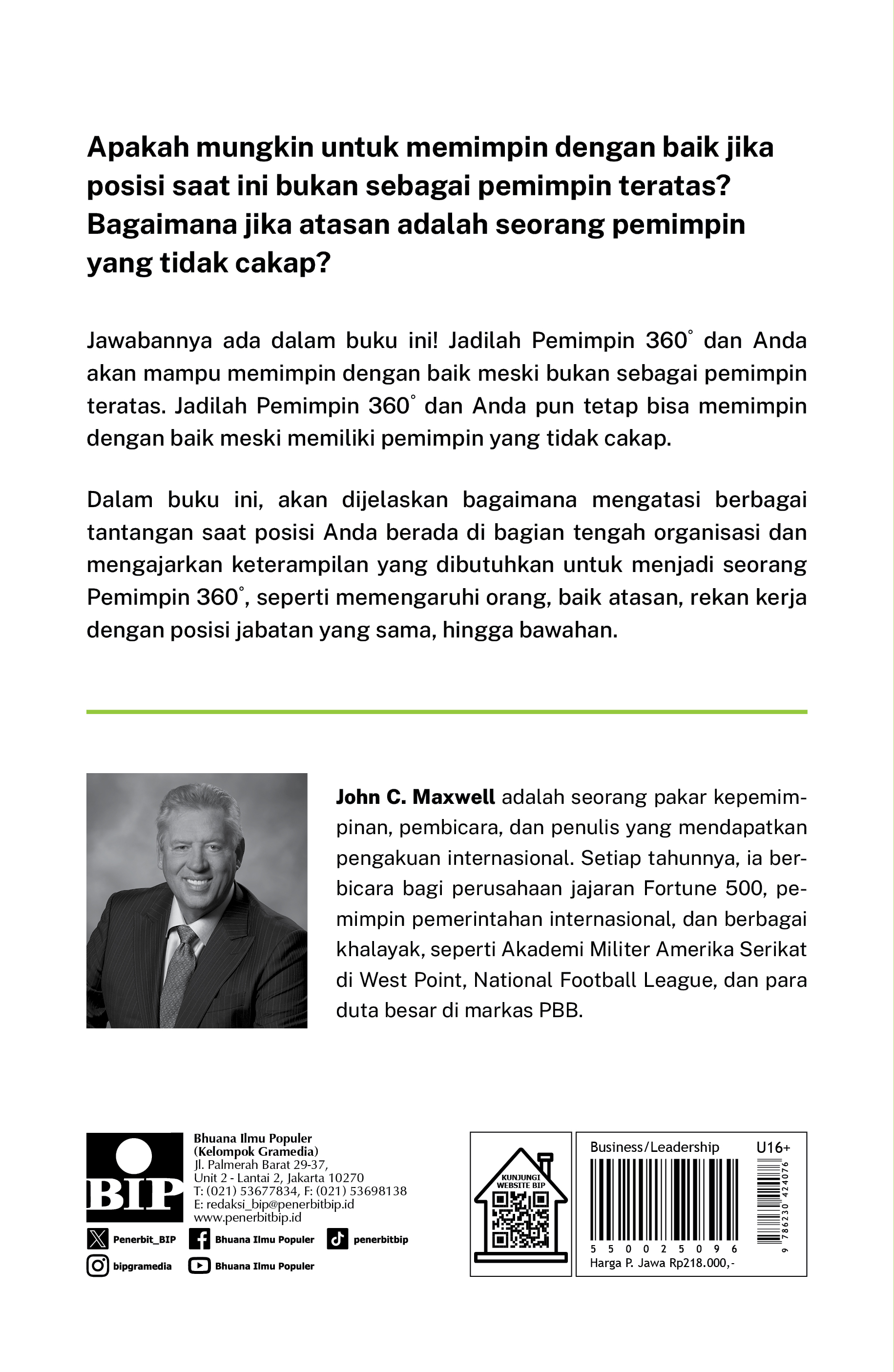 Jawabannya ada dalam buku ini! Jadilah Pemimpin 360° dan Anda akan mampu memimpin dengan baik meski bukan sebagai pemimpin teratas. Jadilah Pemimpin 360° dan Anda pun tetap bisa memimpin dengan baik meski memiliki pemimpin yang tidak cakap.