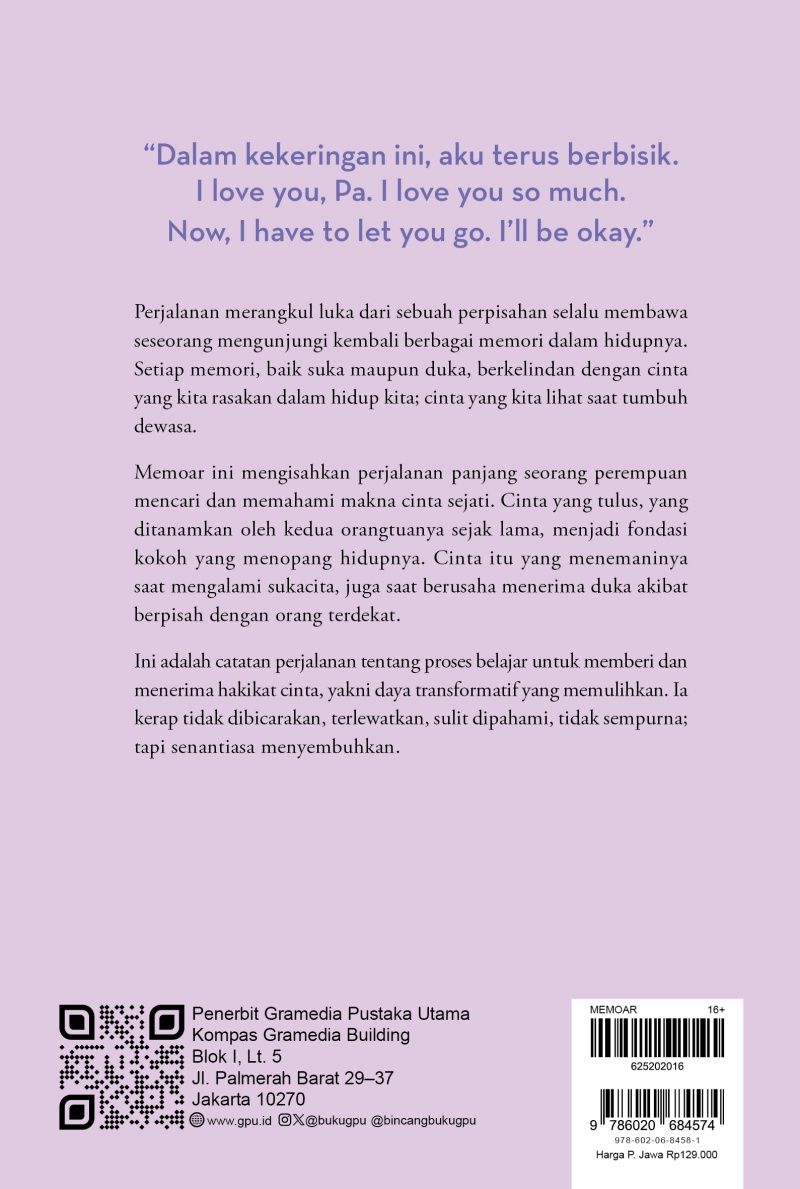 Memoar ini mengisahkan perjalanan panjang seorang perempuan mencari dan memahami makna cinta sejati. Cinta yang tulus, yang ditanamkan oleh kedua orangtuanya sejak lama, menjadi fondasi kokoh yang menopang hidupnya. Cinta itu yang menemaninya saat mengalami sukacita, juga saat berusaha menerima duka akibat berpisah dengan orang terdekat.