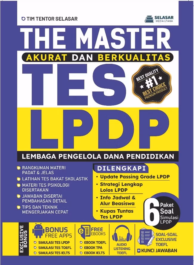 Buku The Master Tes LPDP ini dapat digunakan sebagai panduan dalam menghadapi tes seleksi beasiswa LPDP. Buku ini berisikan panduan lengkap seputar tes seleksi LPDP, informasi lengkap timeline LPDP, informasi passing grade LPDP, ringkasan materi tes LPDP, materi tes kepribadian, serta dilengkapi dengan 6 paket soal latihan beserta kunci jawaban dan pembahasannya. Pada bagian akhir, diberikan tips dan trik untuk lolos tes substansi LPDP.