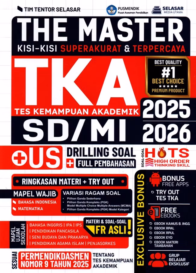 Buku The Master TKA+US SD/M 2025-2026 ini berisi materi dan latihan soal-soal yang diharapkan dapat membantu siswa dalam mencapai prestasi belajar yang memuaskan serta menjadi pribadi yang berkarakter, di samping membantu guru dalam proses belajar mengajar di sekolah.