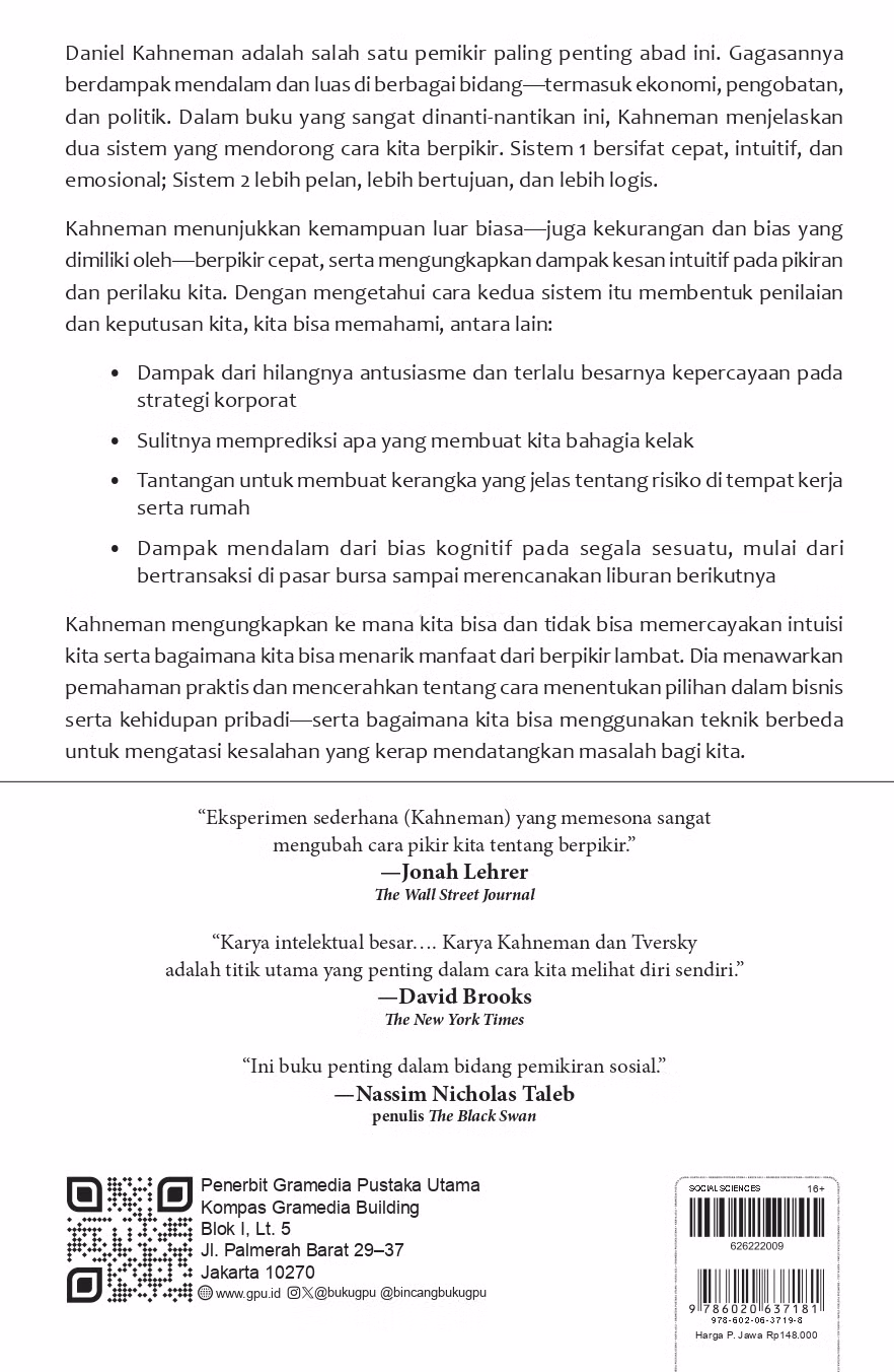 Daniel Kahneman adalah salah satu pemikir paling penting abad ini. Gagasannya berdampak mendalam dan luas di berbagai bidang—termasuk ekonomi, pengobatan, dan politik. Dalam buku yang sangat dinanti-nantikan ini, Kahneman menjelaskan dua sistem yang mendorong cara kita berpikir. Sistem 1 bersifat cepat, intuitif, dan emosional; Sistem 2 lebih pelan, lebih bertujuan, dan lebih logis.