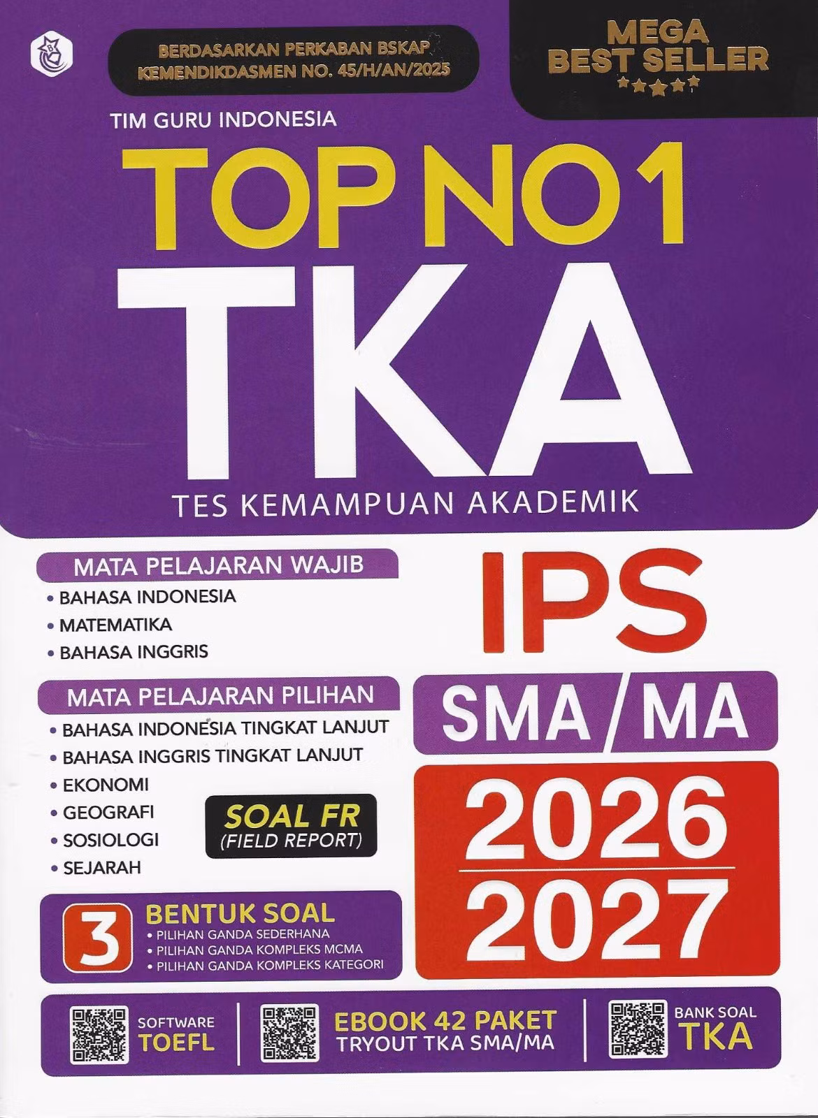 Buku TOP No. 1 Tes Kemampuan Akademik (TKA) SMA/MA IPS 2026/2027 disusun sesuai dengan Kisi-kisi Terbaru TKA, yaitu BERDASARKAN PERKABAN BSKAP KEMENDIKDASMEN NO. 45/H/AN/2025 .