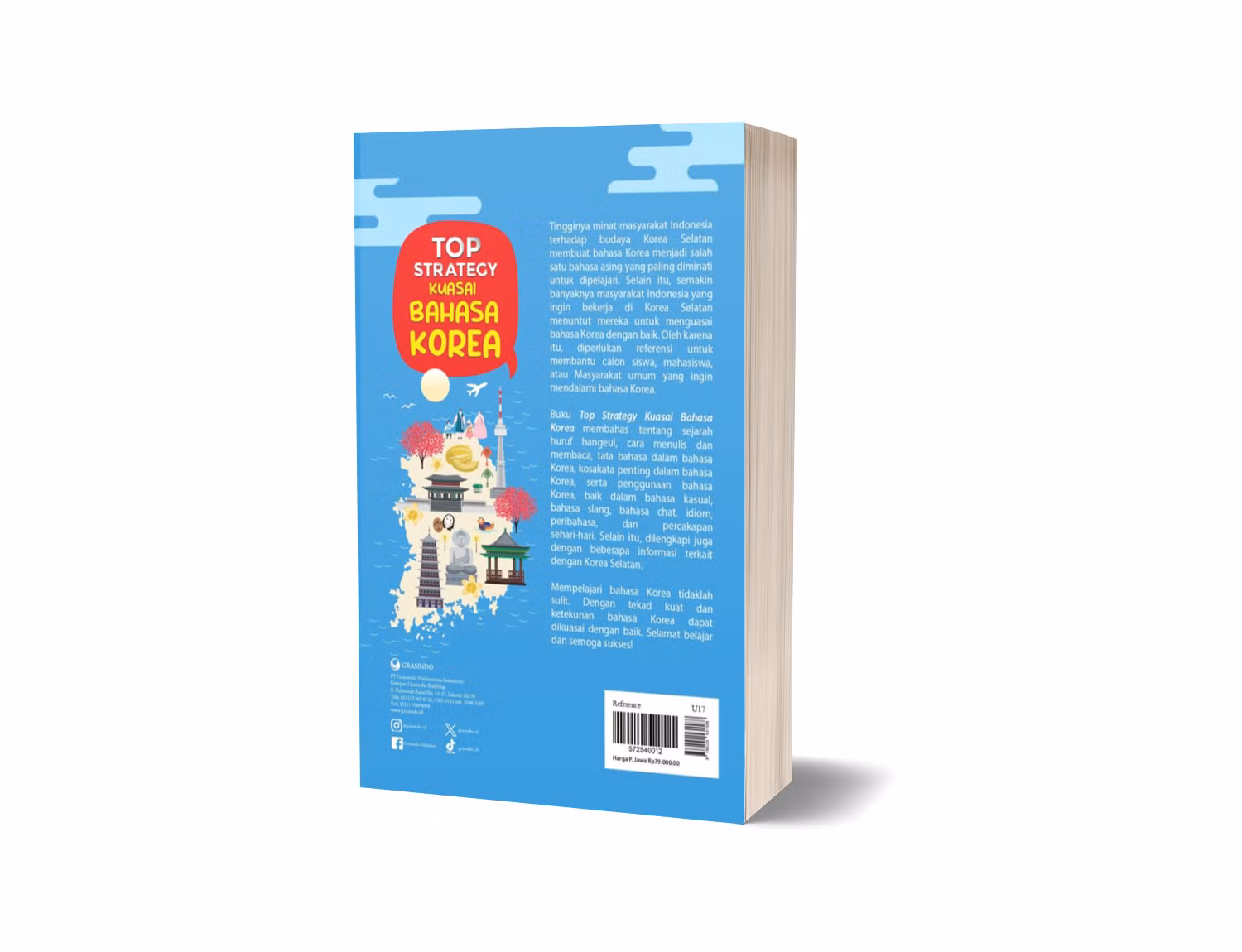 Buku Top Strategy Kuasai Bahasa Korea membahas tentang sejarah huruf hangeul, cara menulis dan membaca, tata bahasa dalam bahasa Korea, kosakata penting dalam bahasa Korea, serta penggunaan bahasa Korea, baik dalam bahasa kasual, bahasa slang, bahasa chat, idiom, peribahasa, dan percakapan sehari-hari. Selain itu, dilengkapi juga dengan beberapa informasi terkait dengan Korea Selatan. Mempelajari bahasa Korea tidaklah sulit. Dengan tekad kuat dan ketekunan bahasa Korea dapat dikuasai dengan baik. Selamat belajar dan semoga sukses!
