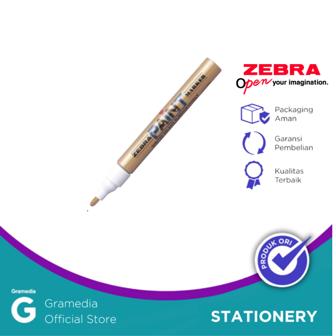 Zebra Paint Marker Gold atau dikenal dengan istilah spidol cat adalah jenis spidol yang digunakan untuk membuat tulisan permanen pada berbagai permukaan seperti kertas, logam, batu, karet, plastik, dan kaca. Tidak seperti kebanyakan spidol permanen, tintanya adalah cat berbasis minyak dan umumnya membutuhkan pengocokan sebelum digunakan, mirip dengan kaleng cat semprot aerosol. Tidak akan pudar dengan paparan sinar UV. Salah satu merek yang terkenal dan sering digunakan yakni Zebra Paint Marker Gold sudah terjamin 100% original made in japan. Sangat cocok digunakan untuk menulis sebab tinta yang diciptakan tidak akan mudah bocor dan sangat berkualitas. Warna gold (emas) paling banyak dipakai sebab warnanya sangat nyata jika dituliskan pada papan tulis berwarna putih. Sehingga penglihatan kita saat membacanya terlihat sangat jelas.